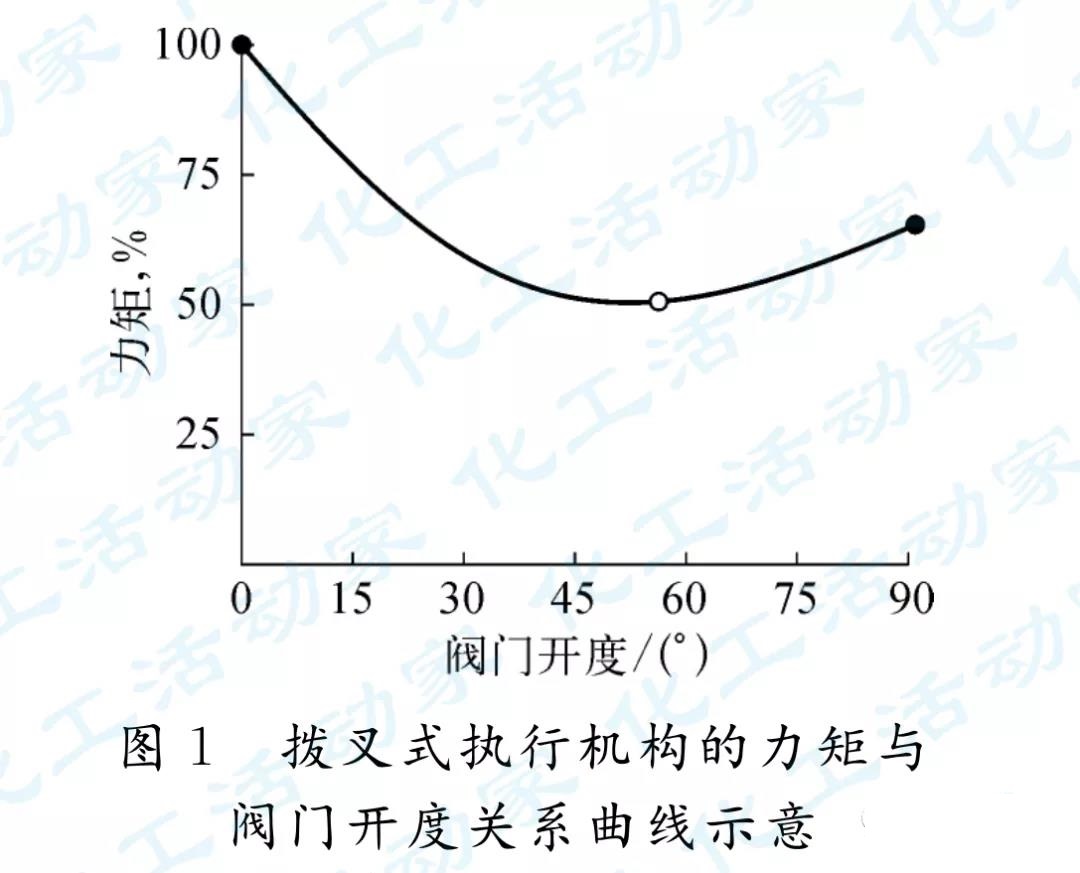 执行机构应满足在0.4MPa风压条件下正常使用寿命不低于3×105次的要求,选型时对输出力矩应有一定余量,通常为阀门最大扭矩的1.5倍;由于速度快,为防止端面撞坏,执行机构还应有避免冲击端盖的限位保护功能。进口阀门选用的执行机构都是拨叉式,拨叉式气缸具有扭矩大、空间小、其扭矩曲线更符合阀特性等特点,常用在大扭矩的阀上,它的原理是通过与活塞一体化的拨叉盘,将活塞的直线运动转化为圆盘的旋转运动,圆盘带动输出轴转动,实现对阀的控制。在执行器开启时输出100%力矩,在中间过程输出力矩发生变化,先减小到50%再增大到75%(关闭),输出力矩为变化值。拨叉式执行机构的力矩与阀门开度关系曲线如图1所示。